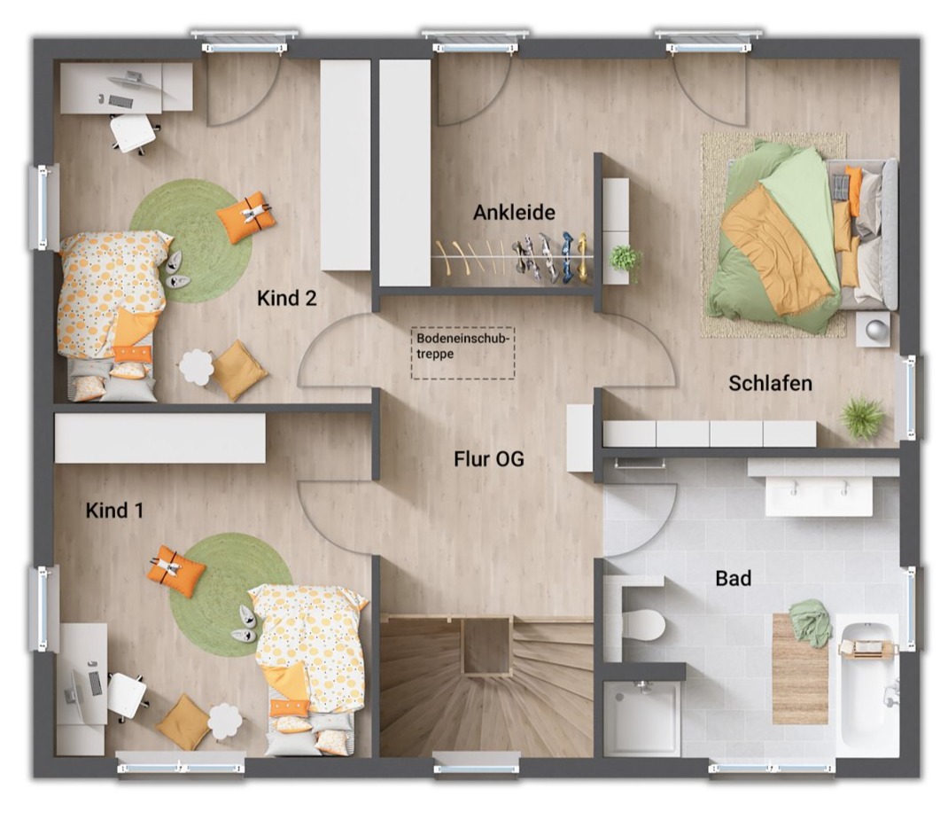- Eltern- und Kinderbereich im Obergeschoss getrennt durch den Flur