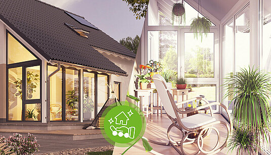 Ein Haus mit Wintergarten verbindet komfortables Wohnen mit der Nähe zur Natur und kombiniert funktionale und optische Bauelemente miteinander. Dabei stellt der Wintergarten den Wärmepuffer zwischen Eigenheim und kalter Außenluft dar. Der ideale Rückzugsort zu jeder Jahreszeit und als Überwinterung für ihre Pflanzen.